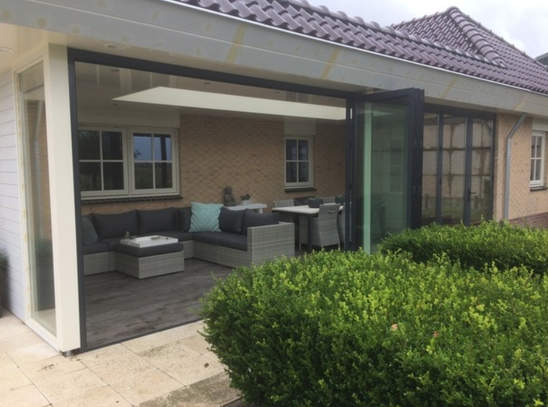 Het voordeel van glazen harmonicadeuren is dat u deze volledig naar de buitenkant van de gevel kunt vouwen, waardoor u een maximale opening naar de tuin creëert. In vergelijking met een schuifdeur, biedt dit een volledige en grotere doorgang naar de buitenruimte. Harmonicadeuren kunt u ook toepassen in een serre, veranda of tuinoverkapping, zodat u hier het hele jaar door van kunt genieten.